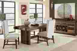 Create a timeless space that feels as natural as it is refined with the Westover Hills II collection by Cindy Crawford Home. Highlighted by breathtaking pine wood veneer work, this collection's rectangle dining table offers touches of rustic styling with distressed details and exposed knots enhanced by contrasting hues of brown. The generous surface tops an illustrious plinth panel base to create a distinctive look that melds well with the set's four coordinating chairs. Each chair features a wing-back silhouette with soft cream upholstery and nail head accent trim.