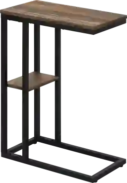 Straight lines and clean angles give this C-shaped Wewatta accent table an elegantly modern look. The rectangular tabletop in a medium brown reclaimed wood-look finish is supported by a black metal frame with a secondary shelf underneath the table for convenient placement of smaller items. Slide this versatile end table under a sofa or chair to place snacks or mobile devices or use as a side table next to a bed. Customer assembly is required.