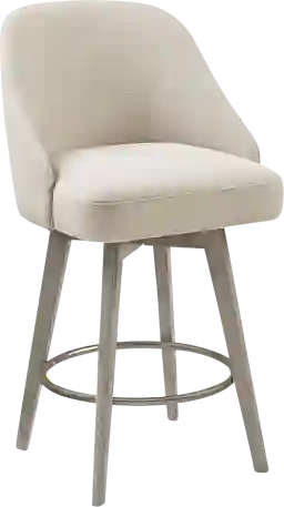 Beautifully crafted, the Whitbourne counter height stool with swivel seat introduces a perfect blend of simplicity and sophistication. This barrel style counter stool features a swivel function, allowing you to easily rotate the rectangular seat. Soft sand-hued upholstery and a smooth reclaimed grey smooth finish on the solid wood legs create a clean transitional look, while a bronze metal ring provides the perfect footrest. The smooth and graceful curves of this counter stool form an elegant silhouette that adds a handsome touch to your dining room. Max weight capacity 300 lbs. Customer assembly is required.