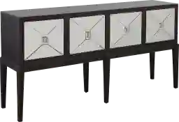 Chic and spacious, this Whitecrowe four door console makes the perfect addition to entryways, dining rooms, and living rooms. The textured black finish highlights the mirrored door fronts while the long slender tapered legs add a sophisticated touch. Behind each of the four doors, there is a fixed shelf that makes it easy to store a variety of items. Add your favorite lamp, family photos, and decor to the spacious top to create the perfect display. Customer assembly is required.
