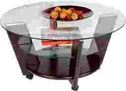 Contemporary design and functional appeal make the Whitlock cocktail table a wonderful addition to your living room. The table is constructed of wood solids with a merlot finish and topped with a 37" round glass top; casters provide easy mobility. The glass center shelf gives you a beautiful way to display coffee table books or collectibles. Whitlock Cocktail TablePartial assembly required.