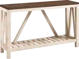 These terms are often used interchangeably, but the distinction usually lies in placement. When placed behind a floating couch to anchor it in an open-concept room, it is referred to as a sofa table. However, because this piece features a slim 14-inch depth and a decorative A-frame design, it also functions perfectly as a console table in an entryway or hallway.