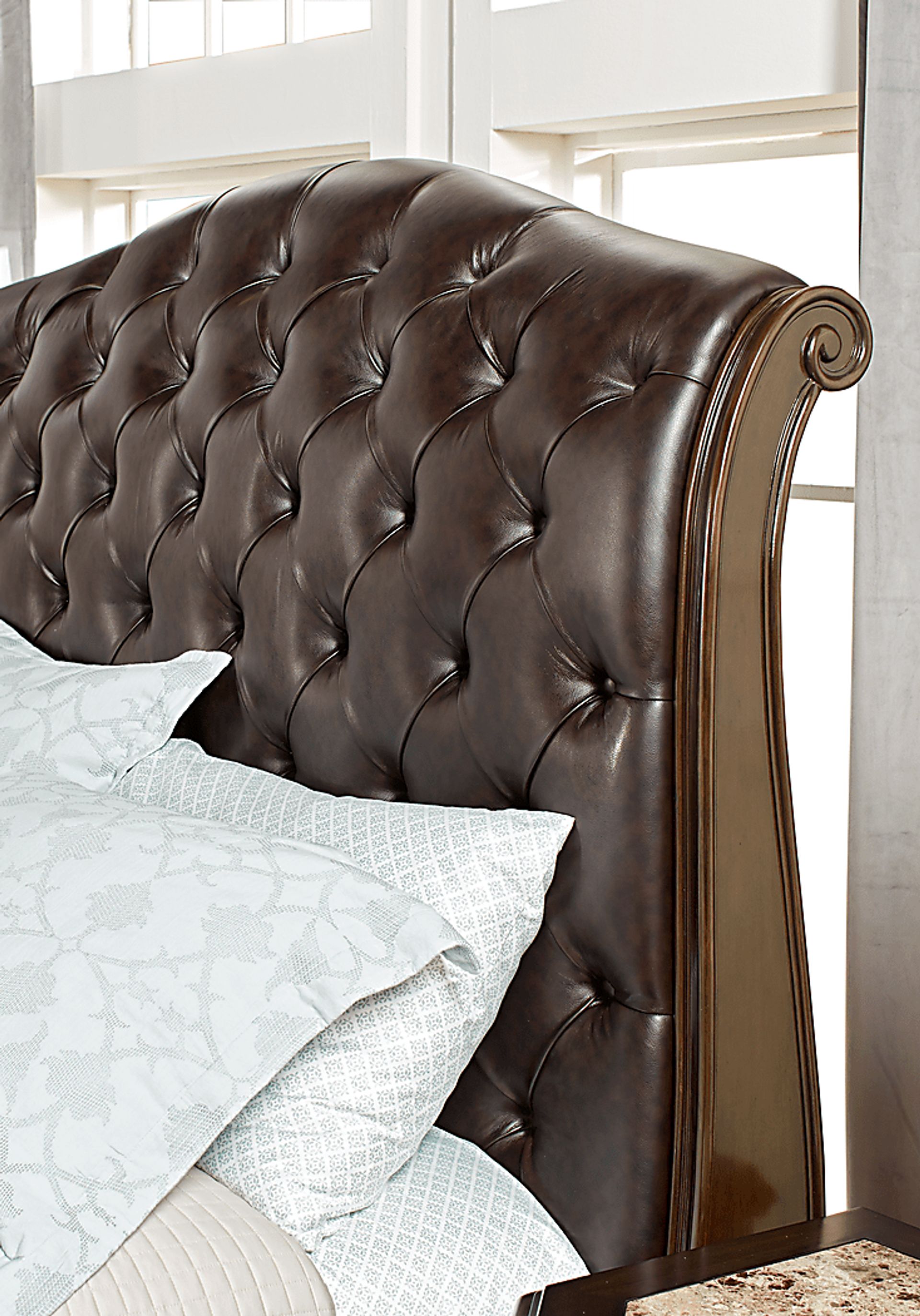 Embodying exquisite traditional design, the Whittington bed has graceful appeal. Constructed of wood solids and mindy veneers in a rich dark cherry finish, the curved sleigh headboard features beautiful tufted upholstery framed by wood. The low footboard features shaped drawer fronts and carving details that emphasize the sophisticated aesthetic even more, while four storage drawers increase its usefulness. Mattress and foundation (if required) sold separately.