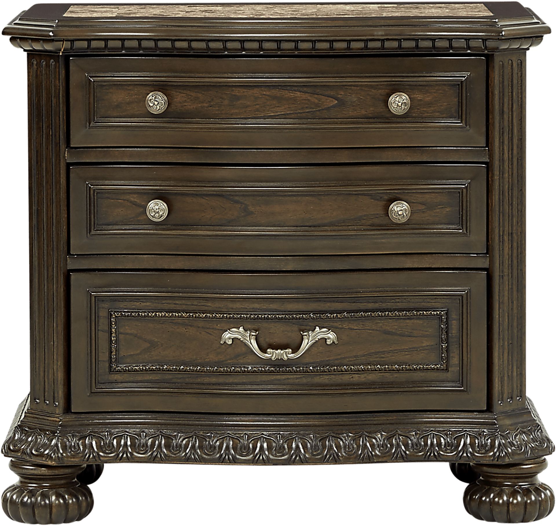 A beautiful addition to your bedroom, the Whittington nightstand is the perfect place to store items within reach. A beautiful insert on the top makes a wonderful base for a framed picture or clock, while the three drawers are the perfect place to store a few objects. French and English dovetail joints aid in stable drawer construction, while felt-lining along the top drawer and dust-proofing along the bottom drawer enhance its usefulness. Constructed of wood solids and mindy veneers with a rich dark cherry finish, bun feet and elegant metal plated hardware create a lasting impression.