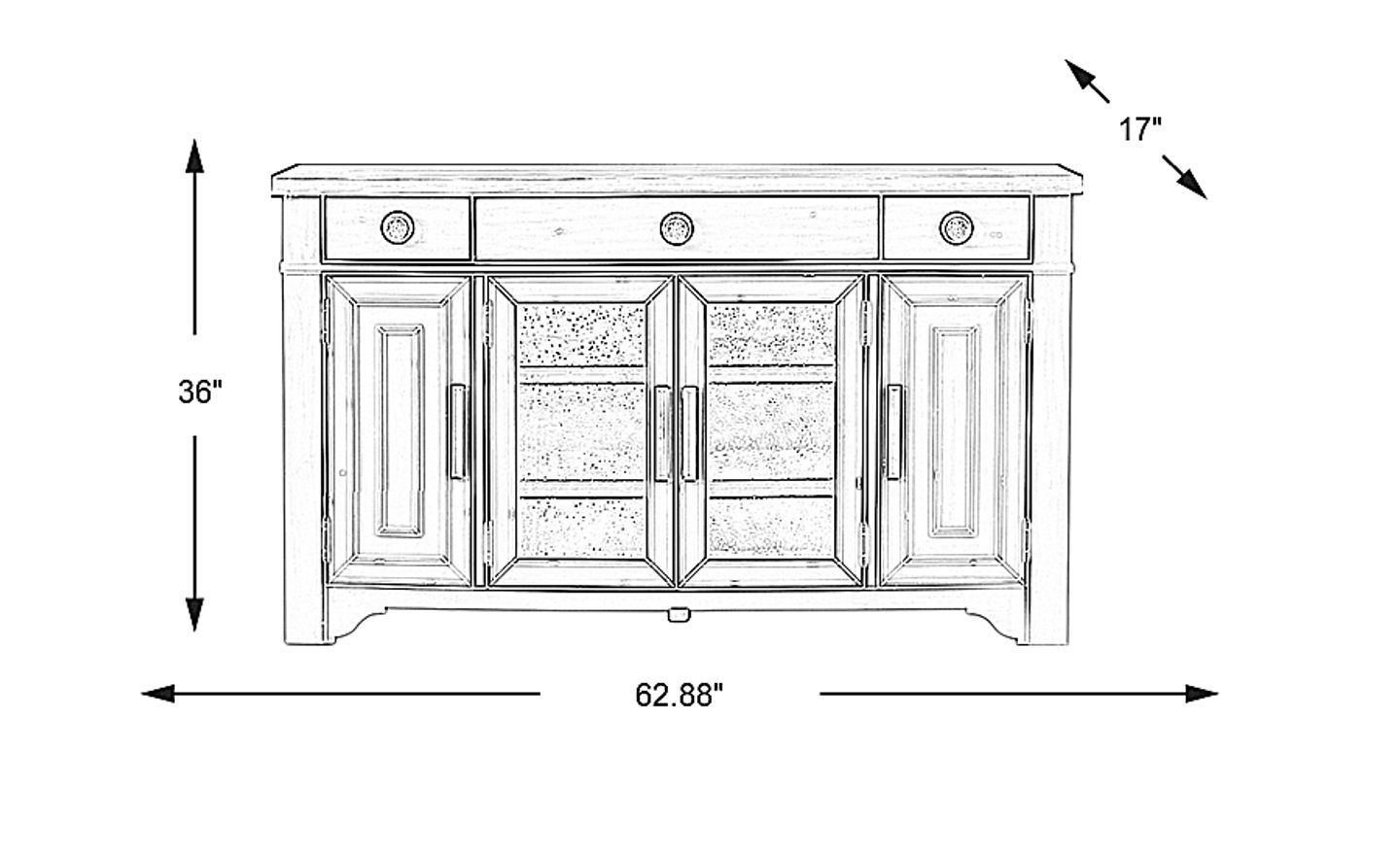 Mixing cottage charm with refined rustic details, the Wicklow Hills server delivers the ultimate farmhouse style for your space. Crafted from pine wood solids and pine veneers in an antique white finish, this piece features a pair of felt lined top drawers with side-mounted full extension, ball bearing glides. For enhanced durability, the drawers are constructed with French dove tail joint fronts and English dove tail joint backs. Scrolled overlays on the glass panels of two of the server's four doors strike a perfect balance between modern elegance and understated sophistication. Internal shelving is adjustable and reversible to suit your needs. Round knob hardware compliments the top of the server's brown finish for the perfect final look.