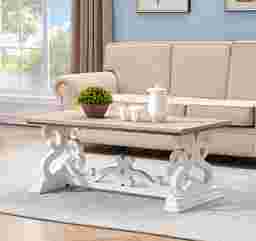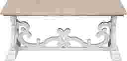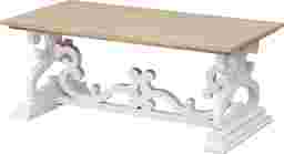 The open scrollwork of the legs and the joining crossbar swirl and curl with an artist flair on this delightfully fun Wiginton cocktail table. Finished in a white with just a hint of rub through and with a natural wood grain top this cocktail has a light and airy feel that will set a cheerful tone in your den or family room. Customer assembly is required.