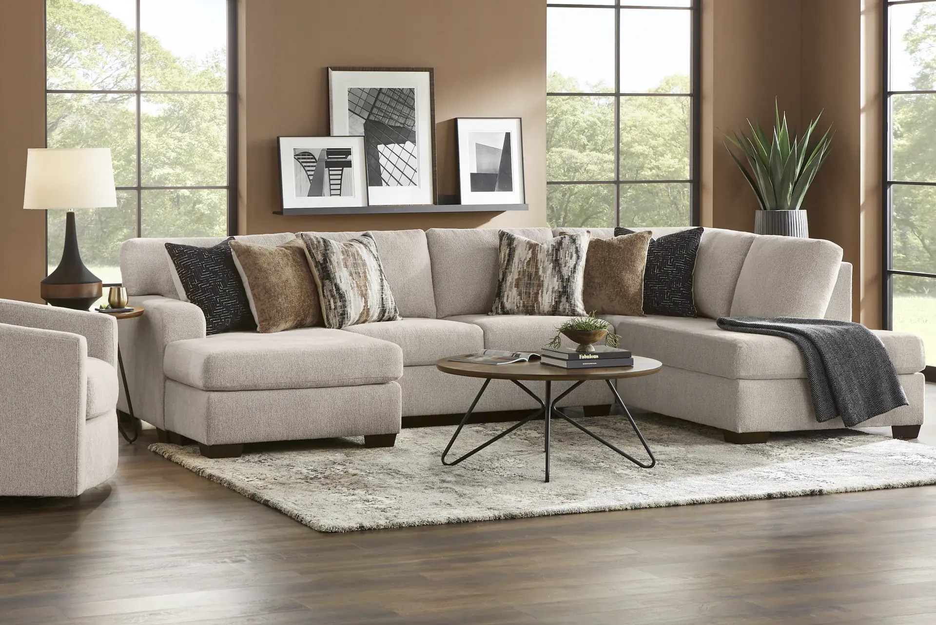 A perfectly luxurious seating experience for family and guests alike, the Wildwood Grove sectional turns any room into a haven for intimate conversation. Its contemporary outline offers more than enough room to seat the entire family, while a unique chaise design on either side ensures there's plenty of space for languid relaxation. Removable back and seat cushions in beige chenille mean this comfortable set is always easy to clean and ready for company. And, the included toss pillows make coordinating with other decor a breeze. Upholstery: 100% Polyester.