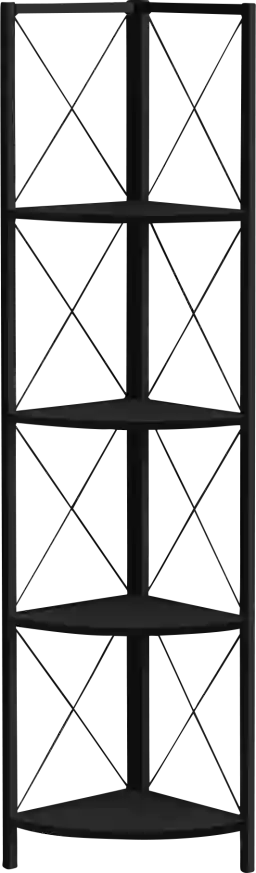 Perfect for photo frames, plants, other decorative items and even kitchen accessories, this transitional-style Wilford corner bookcase will upgrade your decor. Including 4 solid black display shelves, this corner display unit features a three-leg black metal frame and a X-Design to add modern flare wherever you choose to place it. This corner etagere bookcase is sure to impress. Customer assembly is required.