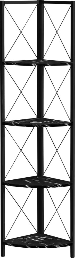 Perfect for photo frames, plants, other decorative items and even kitchen accessories, this transitional-style Wilford corner bookcase will upgrade your decor. Including 4 black marble-look display shelves, this corner display unit features a three-leg black metal frame and a X-Design to add modern flare wherever you choose to place it. This corner etagere bookcase is sure to impress. Customer assembly is required.