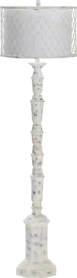 Chalk white washed finish on faux wood turning; the Willow Way floor lamp is finished elegantly with a washed metal mesh and ivory burlap shade. Partial assembly may be required.