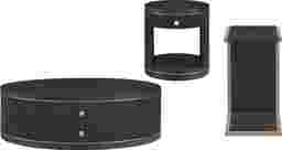 Bold luxury sets the scene when it's time to unwind around the Wilshire table collection. Designed with a carefully considered palette of materials and colors, this black contemporary table set features stunning craftsmanship such as wood-grain-like details, reeded carvings and gold-colored metal banding. The oval cocktail table offers two spacious central drawers for storage space, while the round end table provides a top drawer and open bottom shelf for display space. USB charging ports on the end table makes it convenient to keep media devices charged and close by. The chairside table offers a c-shaped silhouette and stylish contrasting with its light brown finished frame. Round metal knobs in a matching gold finish offer a stylish contrast and sophisticated final touch.