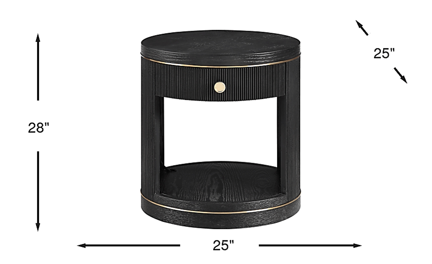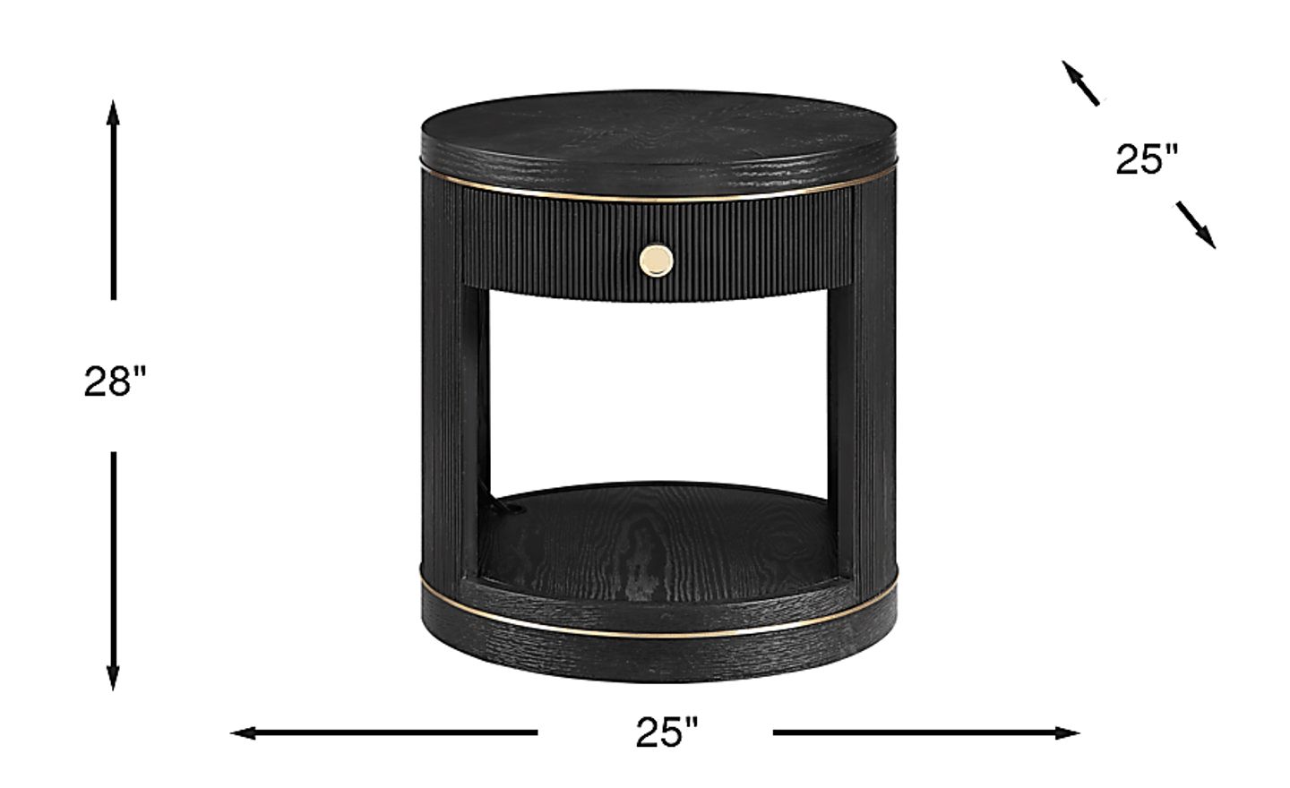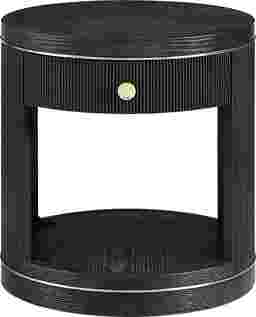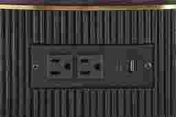 Bold luxury sets the scene when it's time to unwind around the Wilshire table collection. Designed with a carefully considered palette of materials and colors, this black contemporary end table features stunning craftsmanship such as wood-grain-like details, reeded carvings and gold-colored metal banding. The top drawer provides storage space, while the open bottom shelf offers nice display space. A USB charging port on the side makes it convenient to keep media devices charged and close at hand. The round metal knob in a matching gold finish offers a stylish contrast and sophisticated final touch.