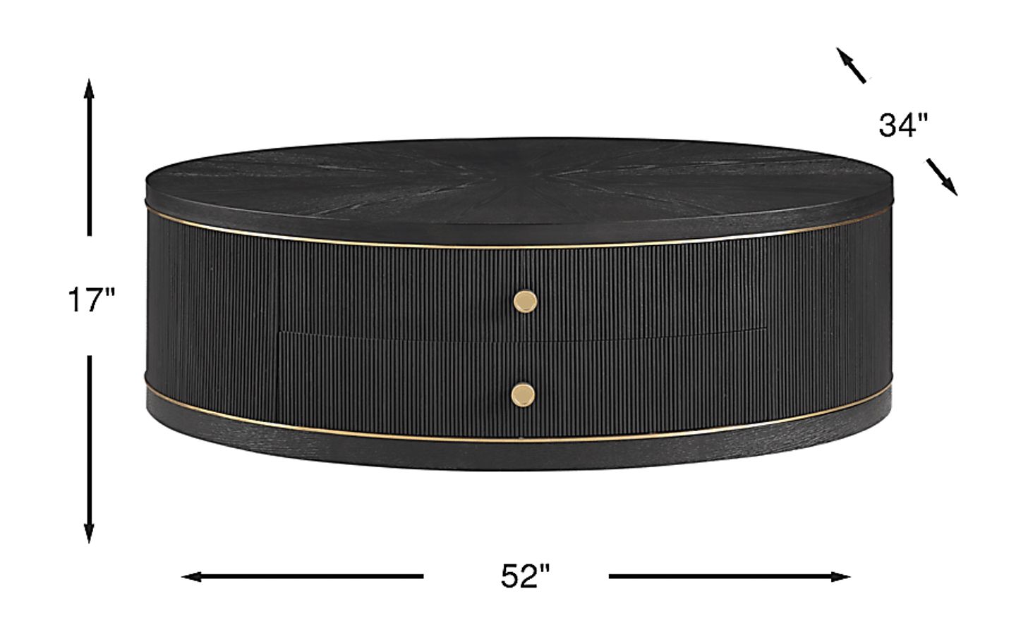 Bold luxury sets the scene when it's time to unwind around the Wilshire table collection. Designed with a carefully considered palette of materials and colors, this black contemporary cocktail table features stunning details like all-around reeding and gold-colored metal banding. Two spacious central drawers provide storage space to help keep your room organized and clutter-free. Round metal knobs in a matching gold finish offer a stylish contrast and sophisticated final touch.