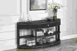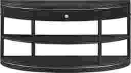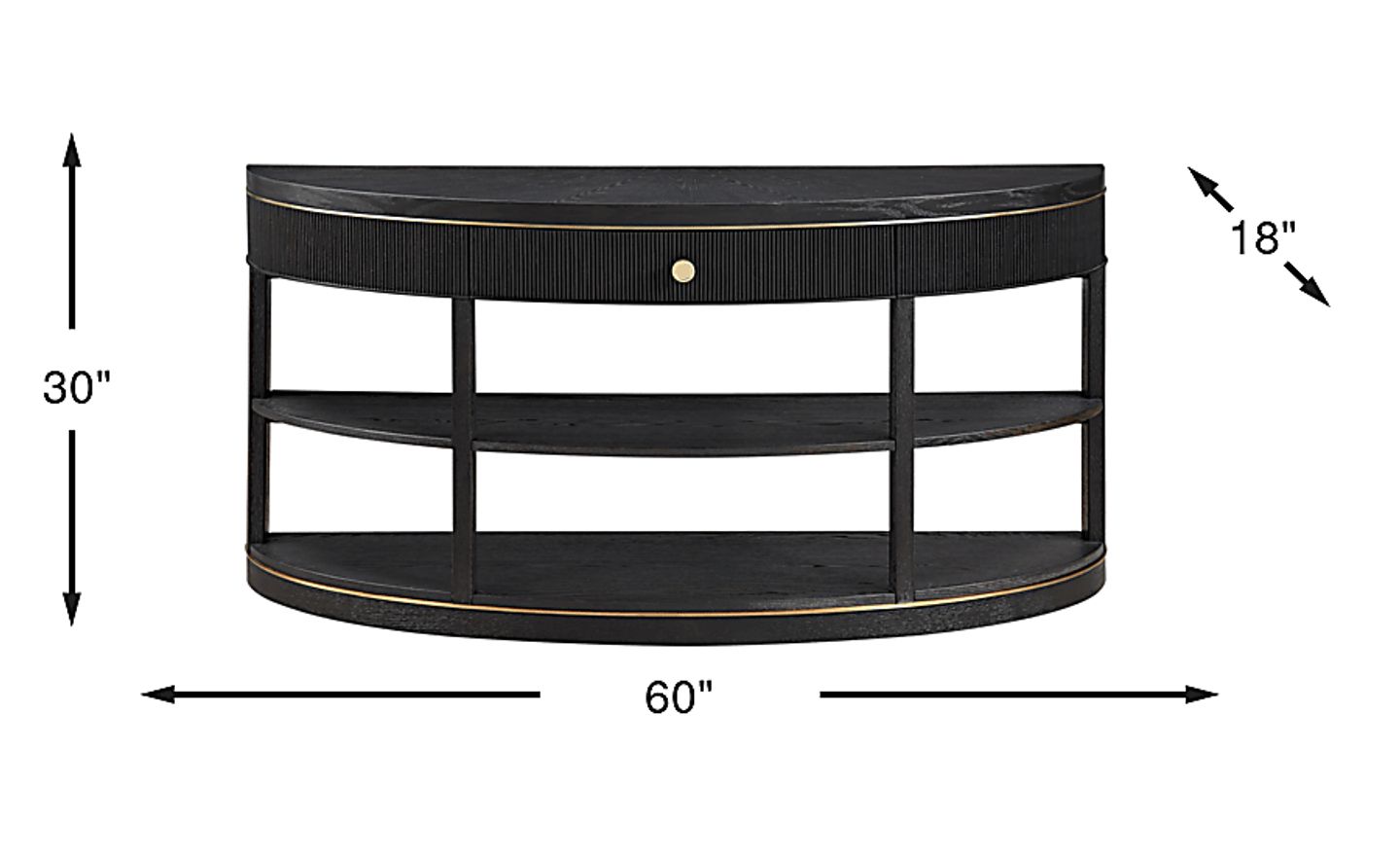 Bold luxury sets the scene when it's time to unwind around the Wilshire table collection. Designed with a carefully considered palette of materials and colors, this black contemporary sofa table features stunning craftsmanship such as wood-grain-like details, reeded carvings and gold-colored metal banding. The top drawer provides storage space, while the two open shelves offer ample display space. The round metal knob in a matching gold finish offers a stylish contrast and sophisticated final touch.