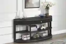 Yes. In open-concept suburban homes, a sofa table is a key design tool used to define the living area and provide a visual "anchor" for a sofa that isn't against a wall. The half-circle (demilune) shape of this contemporary piece is particularly effective for floating layouts, as it creates a soft transition between the living and dining spaces while removing sharp corners from high-traffic walkways.