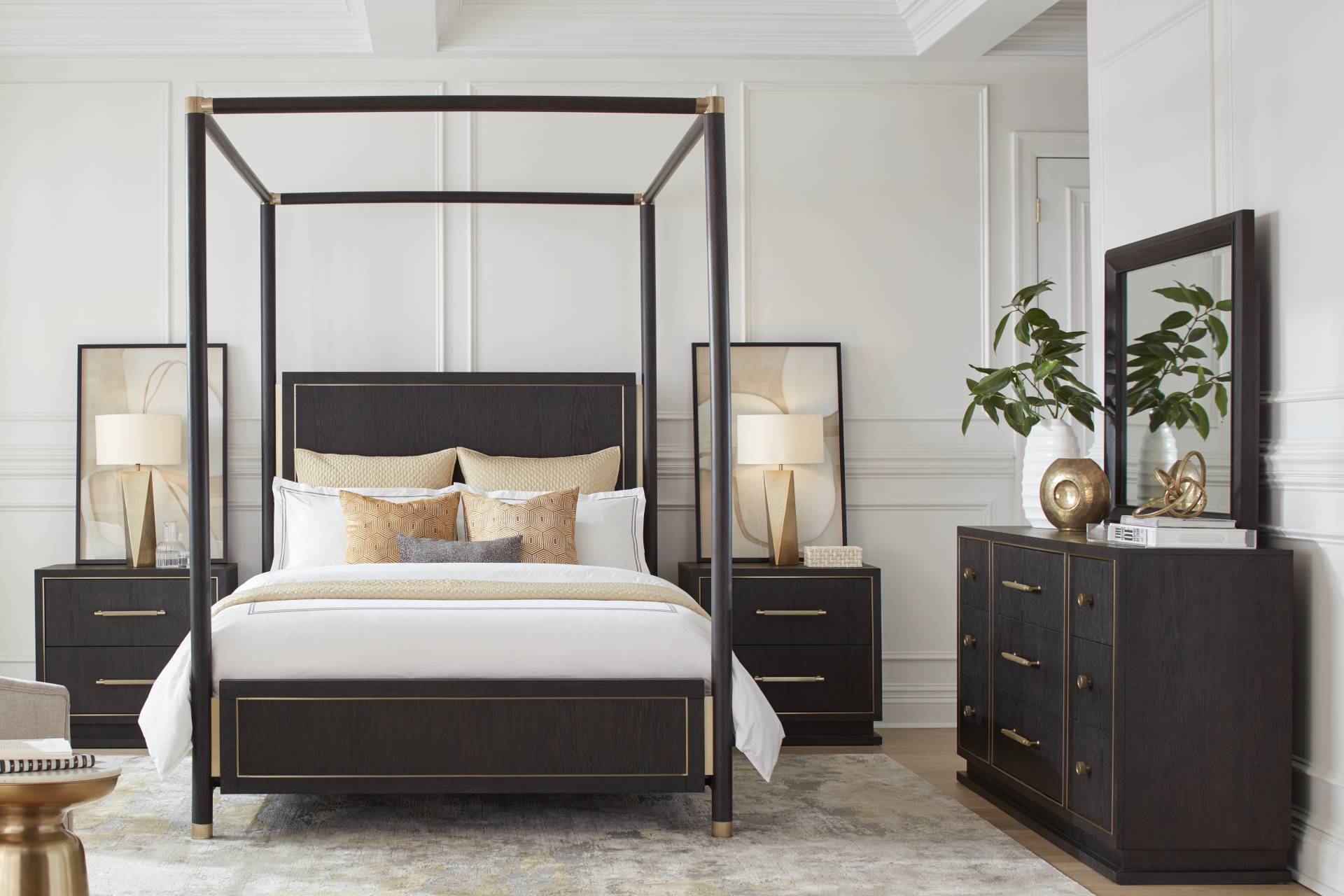 Luxurious style and refined sensibilities shine through every sleek line of the Drew & Jonathan Wilshire bedroom. Throughout this contemporary collection, a carefully considered palette of materials and colors allows each detail to stand out. The four-poster canopy, headboard and footboard are trimmed with gold-colored metal, all resting on a frame with hickory veneers finished in a deep, rich merlot. Elegant legs capped with gold-colored metal anchor the head and foot of the bed. Distinctive plinth bases are showcased on the included dresser and nightstands, which also feature metal knobs and textured bar pull hardware for a thoroughly coordinated design. A hidden USB charging port adds functionality to the nightstand and the included mirror can be mounted to the dresser. Gold-colored framing details encircle the two drawers of the nightstand and nine drawers of the dresser to finish the look with a glint of contrast. Mattress and foundation (if required) sold separately.