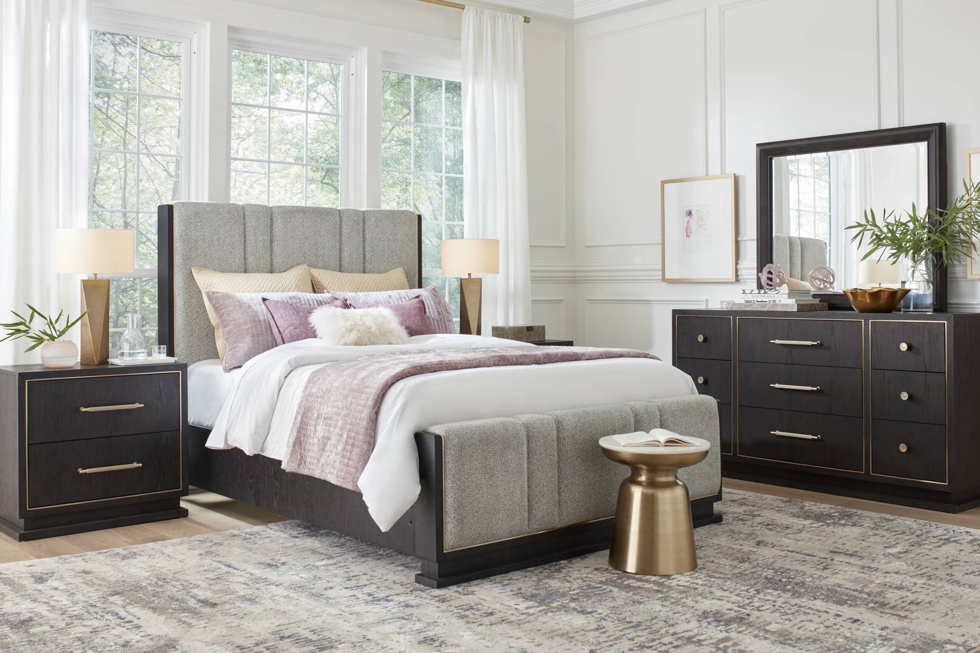 Luxurious style and refined sensibilities shine through every sleek line of the Drew & Jonathan Wilshire bedroom. Throughout this contemporary collection, a carefully considered palette of materials and colors allows each detail to stand out. The channeled gray upholstered headboard and footboard are trimmed with gold-colored metal, all resting on a frame with hickory veneers finished in a deep, rich merlot. Notched plinth bases at the head and foot of the bed are mirrored in the included dresser and nightstands, which feature metal knobs and textured bar pull hardware for a thoroughly coordinated design. A hidden USB charging port adds functionality to the nightstand and the included mirror can be mounted to the dresser. Gold-colored framing details encircle the two drawers of the nightstand and nine drawers of the dresser to finish the look with a glint of contrast. Mattress and foundation (if required) sold separately.