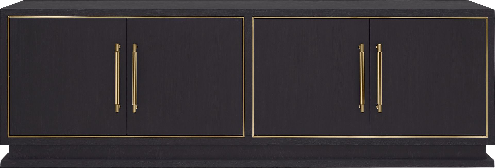 Upscale style and refined sensibilities shine in every line and angle of the Drew & Jonathan Wilshire entertainment console. Throughout this contemporary piece a carefully considered palette of materials and colors allows each detail to stand out. Hickory veneers finished in a deep, rich merlot are inlaid with gold-colored metal, framing a pair of two-door cabinets. Inside each cabinet, a central shelf offers space for media and devices. Textured bar pull hardware adds a glint of contrast, and a notched plinth base completes the look.