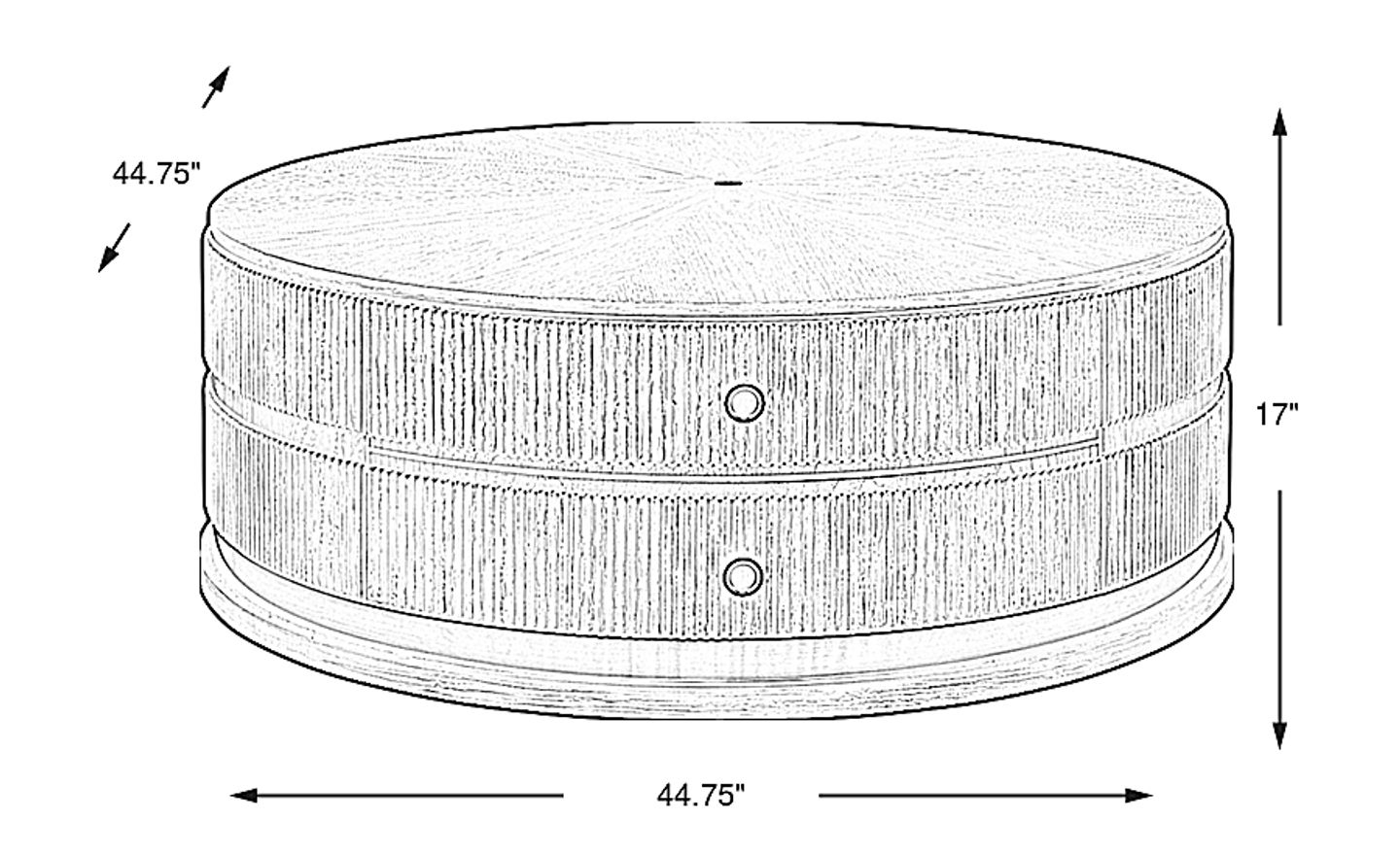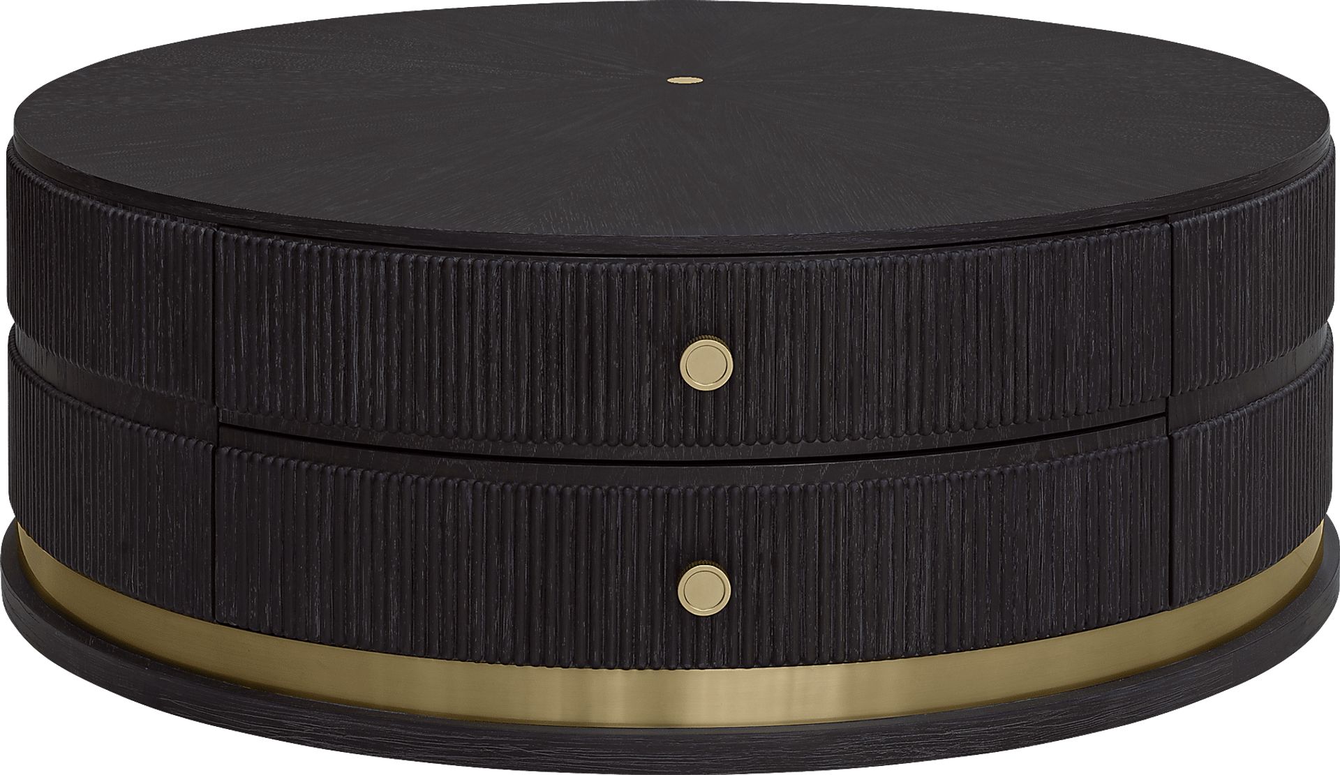 Bold luxury sets the scene when it's time to unwind around the Drew & Jonathan Wilshire cocktail table. Designed with a carefully considered palette of materials and colors, this contemporary piece features stunning details like all-around reeding and gold-colored metal banding. Round metal knobs reveal the spacious central drawers, and a matching gold-colored dot in the center of the tabletop creates a point of contrast in the dark merlot finish.