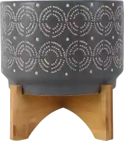 The Wilshyre ceramic planter features a swirl and dot design on the exterior. It has a natural finish and the wood stand is glued to the planter. This beautiful piece will be a great addition to your living room or entry way.