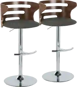 This stool set combines the structural integrity of a metal frame with the aesthetic warmth of bent wood. The metal pedestal base offers a high degree of stability and a modern, polished finish. The backrest is crafted from slotted bent wood, a material favored in mid-century modern design for its unique ability to be molded into comfortable, organic shapes while remaining durable and resilient over time.