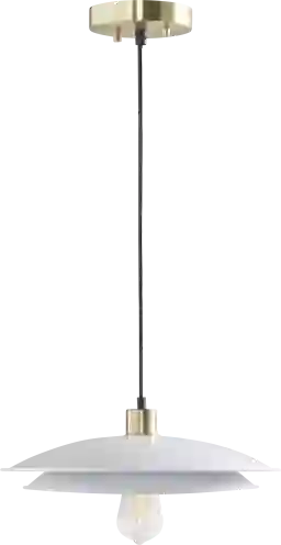 The Winder Summit White Pendant provides a simple and classic addition to your dining room or kitchen decor. This single bulb hanging pendant features a double layered disc shade, in a matte white finish, to create a mid-century modern design. The gold ceiling base complements the shade, for a striking look. Elevate and brighten your space with the unique and eye-catching style of this pendant light. Professional installation by an electrician is recommended.