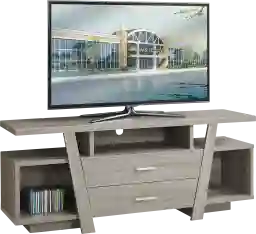 Grab your guests' attention with the contemporary styling of this Windon TV stand that accommodates all TV sizes with a center stand. Constructed with thick panels in a chic dark taupe finish, this stand features open concept shelving, two storage drawers ideal for keeping your electronic components. Featuring symmetrical lines and a unique flair this TV stand is a must have in any modern entertainment room. Customer assembly required.