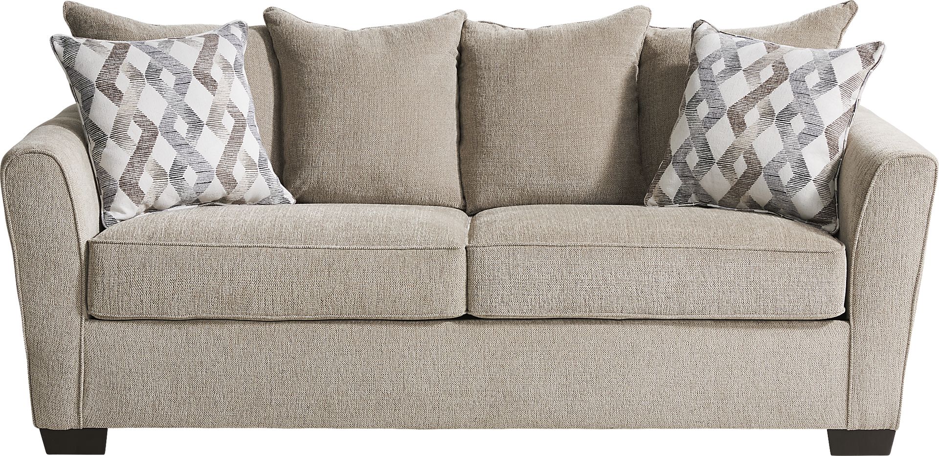 Bring transitional style and plenty of comfort to your living space with the Windward Way sofa. Upholstered in a soft, durable fabric, this piece comes in a mocha color and features loose seat cushions for longevity. Stylish flair arms and brown-finished block legs complete the look, while the two designer toss pillows add a touch of color. 100% Polyester.