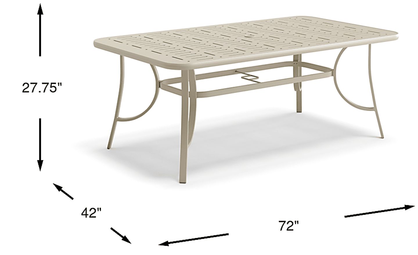 Made of solid aluminum in a sand finish, the Windy Isle dining table is a durable choice for outdoor meals and refreshments. The 42 x 72 inch rectangular top is enhanced with decorative stamped detailing and supported by graceful curved legs. This low maintenance rust resistant table is sure to be enjoyed for many seasons to come.