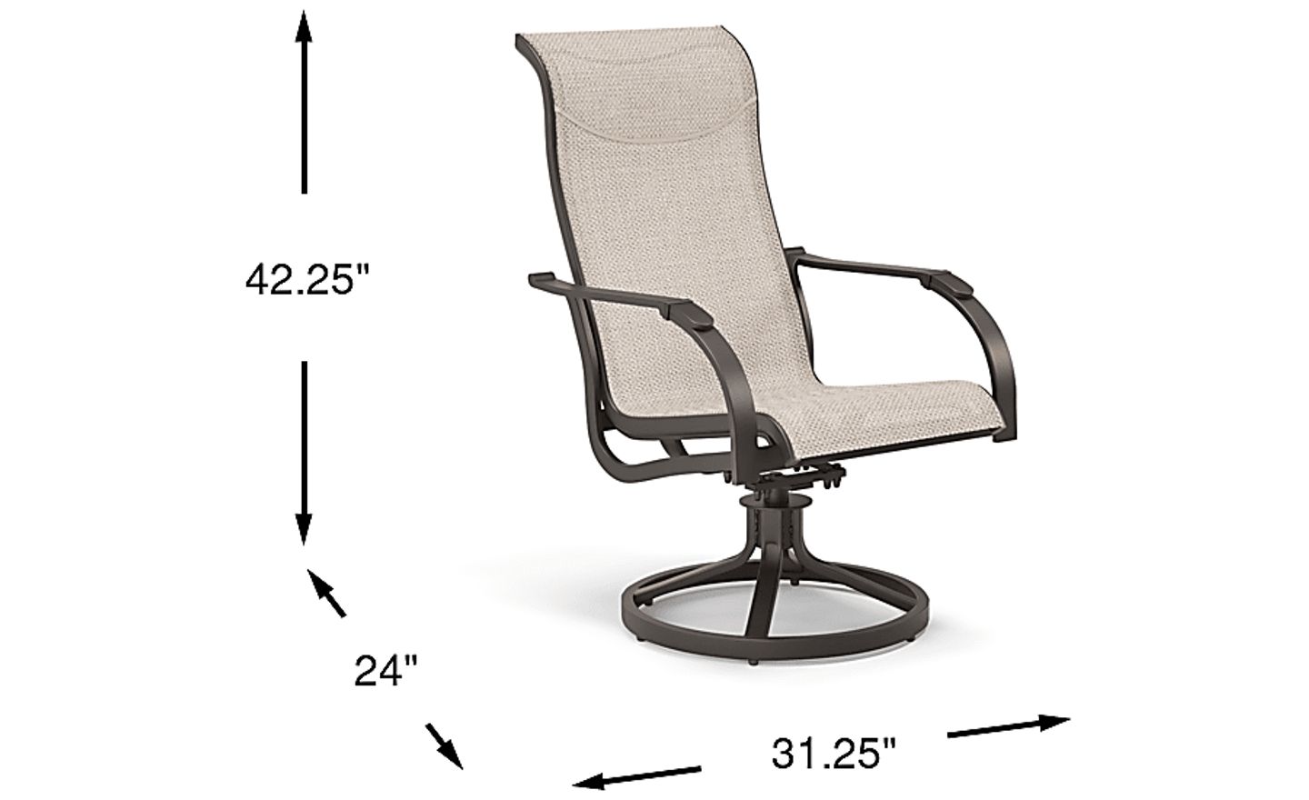 With its smooth swivel and rocking motion, the Windy Isle chair is made for enjoying relaxing outdoor meals, refreshments and conversation. The chair is crafted with a bronze finished rust resistant aluminum frame and durable sling style seating.