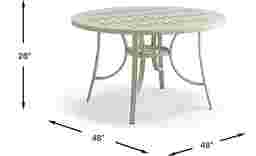 Made of solid aluminum in a sand finish, the Windy Isle dining table is a durable choice for outdoor meals and refreshments. The 48 inch round top is enhanced with decorative stamped detailing and supported by graceful curved legs. This low maintenance rust resistant table is sure to be enjoyed for many seasons to come.