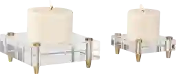 The Winnenmac is a heavy crystal block candleholders, suspended by machined brass finished legs. Includes one 3x 3 and one 4x 3 distressed off-white candles. Customer assembly is required.