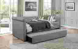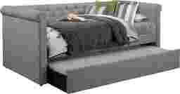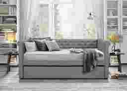 Perfect for the flexible need of sleep space in your home, the Winona Way daybed provides a stylish and functional option to extend your hospitality. The plush framing and rolled arms of the gray-covered button-tufted twin daybed lends to the classic look of your home. Stored discretely below the main sleeping platform is a roll-out trundle. Customer assembly required. Mattress not included.
