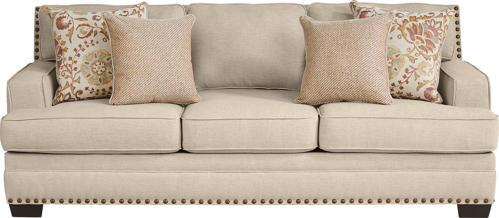 Offering traditional charm, the Winsborough gel foam sleeper sofa is a stylish centerpiece for your living room. Its woven fabric features a designer-friendly beige color. Adding beautiful detail, a nailhead border resides along the base and back of this piece. Loose, reversible seat and back cushions extend the lifetime of your sofa, while coordinating accent pillows showcase geometric and floral-inspired prints. Tucked inside is a queen size Nature's Bed mattress with premium gel foam comfort for overnight guests. Upholstery: 100% Polyester.