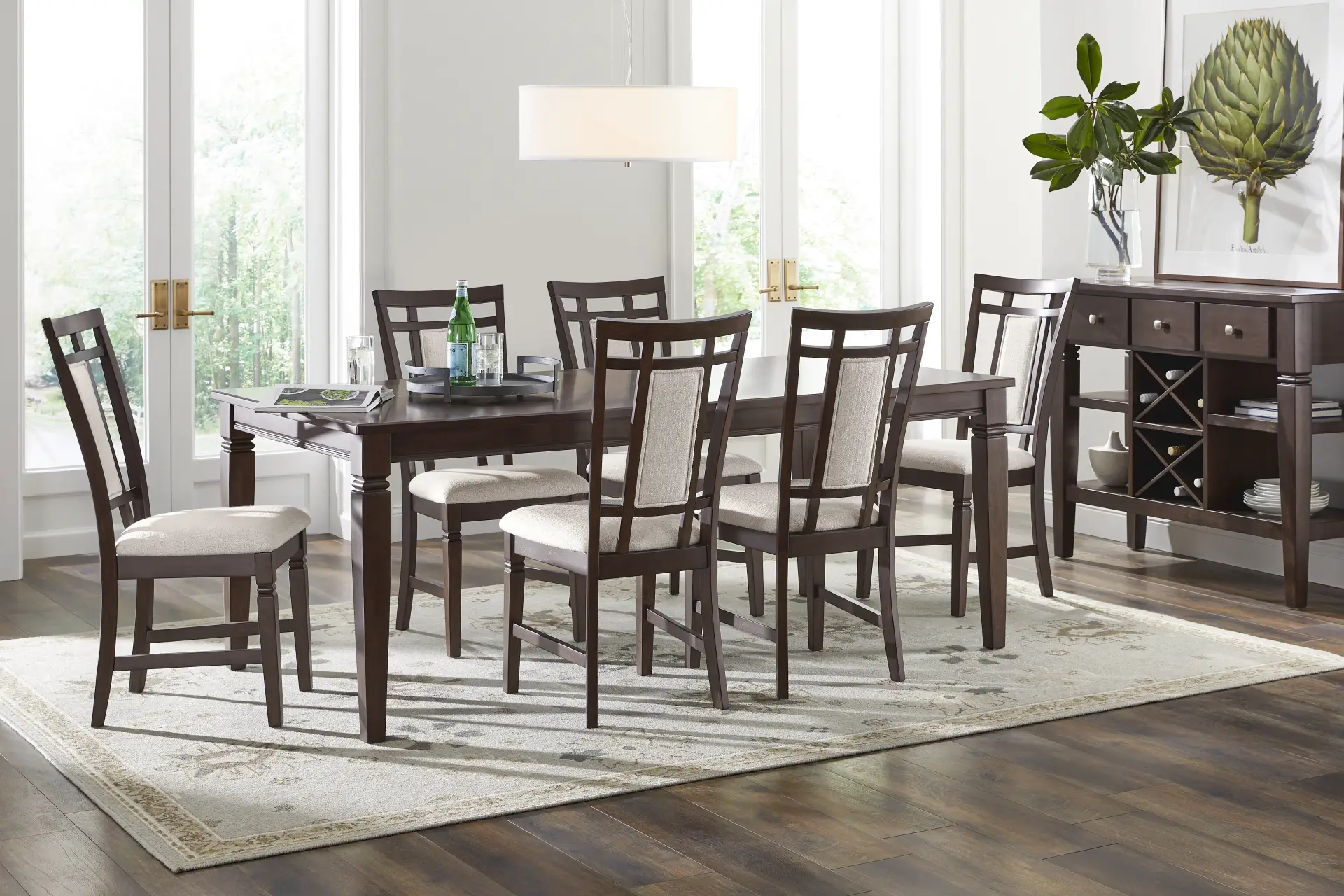 An area rug is an excellent way to define your dining space. For a table of this scale (78" x 41.75"), we recommend a rug that is at least 8' x 10'. This ensures that when guests pull their chairs out to sit down, the chair legs remain on the rug, providing a level surface and protecting your flooring. For a high-contrast look, consider a light-colored or neutral rug to make the deep brown cherry finish stand out.