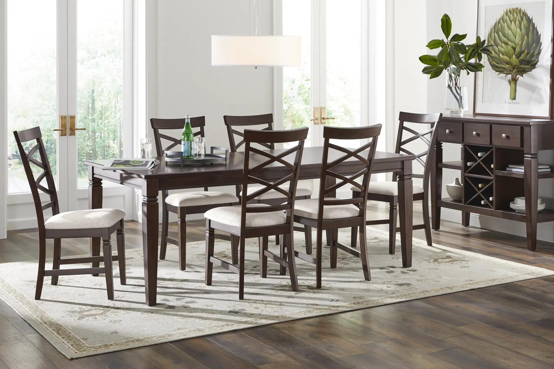 An area rug is an excellent way to define your dining space. For a table of this scale (78" x 41.75"), we recommend a rug that is at least 8' x 10'. This ensures that when guests pull their chairs out to sit down, the chair legs remain on the rug, providing a level surface and protecting your flooring. For a high-contrast look, consider a light-colored or neutral rug to make the deep brown cherry finish stand out.