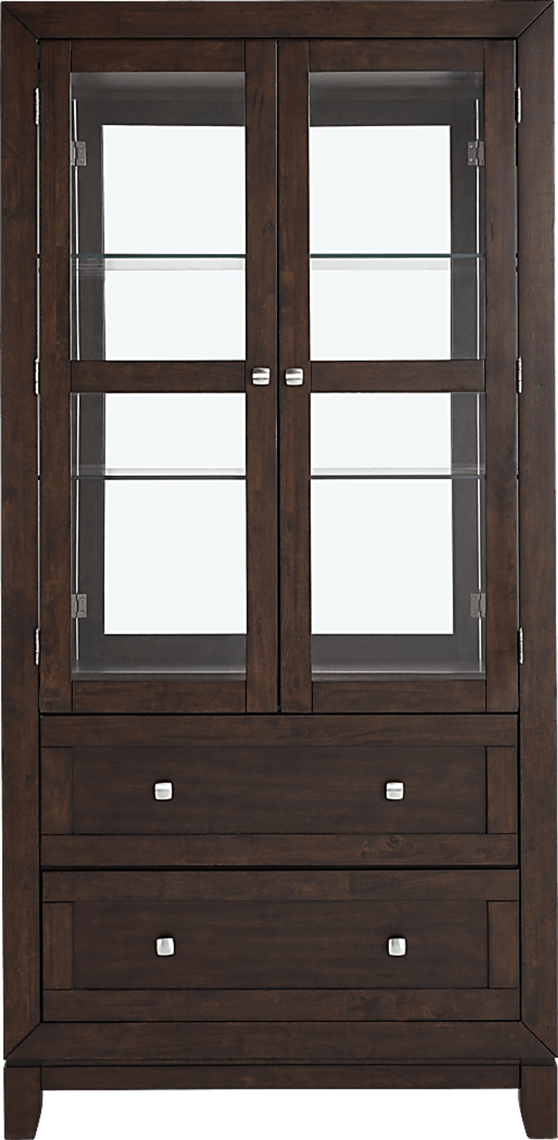 Share more meals together with the chic and contemporary Winslow collection in your dining room. Crafted with cherry veneers in a brown cherry finish, this piece features glass on the sides and doors for a clear view of collectibles. The mirrored back and touch light further highlight your favorite pieces. The pair of bottom drawers are ideal for keeping clutter under control.