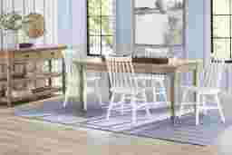 Exuding warmth and charm like a cozy fireplace on a long winter's night, the Winsor dining room creates a welcoming space that seamlessly combines functionality with timeless design. Crafted of wood solids with oak veneers in a natural finish, this rustic collection features a dining table with decorative turned legs and a rectangular shape perfect for both intimate meals and larger gatherings. The collection also includes four side chairs with spindle backs and a complimentary white finish for a heartwarming final touch.