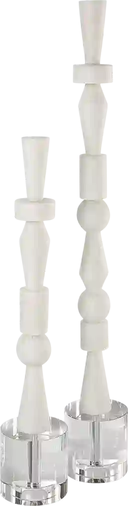 Geometric, stacked totems crafted from ivory man-made stone that accurately replicates the look of Wisby marble and is accented by an elegant crystal foot. Sizes S-4x21x4, L-4x28x4. Customer assembly is required.