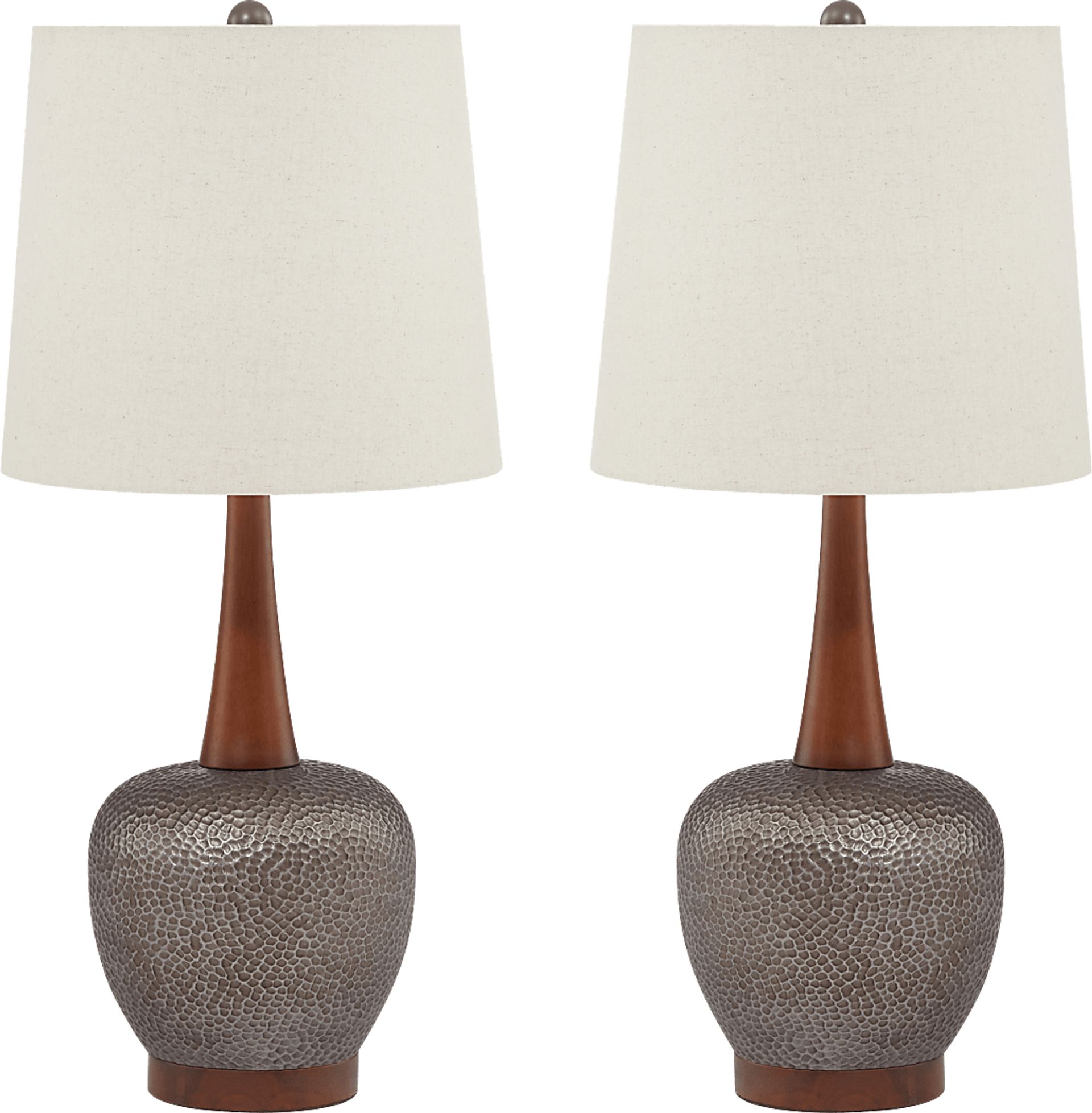 Gracefully understated, the Wiskon Way table lamp set casts an aura of irresistible charm. Crafted of molded resin, each lamp's charcoal colored base features meticulous hammered effects while a neutral-tone shade enhances the overall silhouette with effervescent simplicity. Bulbs with a maximum capacity of 100 watts are required for these units.