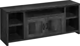 Modern technology finds a rustic home with this modern farmhouse-style Wisperbreath TV stand in a black reclaimed wood-look finish. Neatly organize your entertainment center equipment and other items among the five shelves and the two storage areas behind two doors with black metal handles. The wide top panel accommodates most TVs, while the center shelf underneath includes an opening in the back to easily pass through cables and wires. Each side has an adjustable shelf that can be positioned at your desired height to create storage areas in different sizes. This robust media console features thick-panel construction and clean lines for a warm yet sophisticated look that fits most living room or bedroom decors. Customer assembly is required.