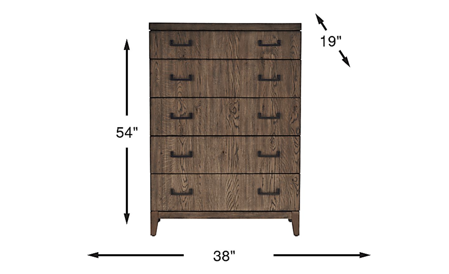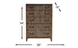 Mixing sleek flair with everyday elegance, the Woodland Park chest delivers a stylishly simple piece for your bedroom. Crafted of knotty oak veneers in a brown finish, this chest features five drawers constructed with English dovetail joints and ball bearing glides for enhanced durability. Dust proofing on the bottom drawers make them perfect for storing socks, shirts and more. Dark cast metal pull hardware on the drawers offers a sublime final touch.