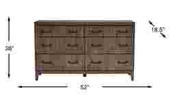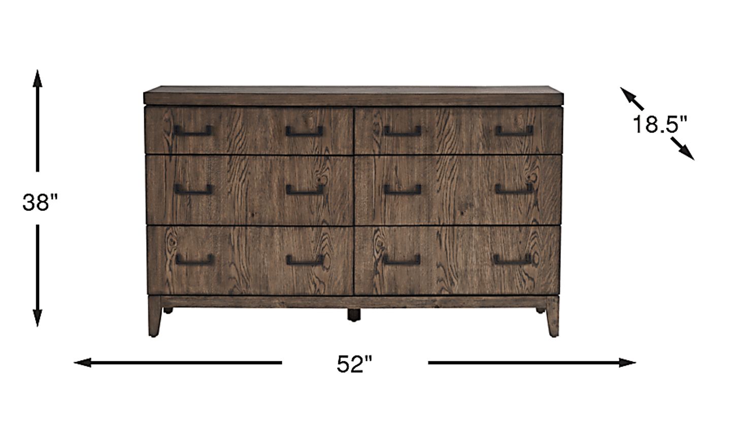 Mixing sleek flair with everyday elegance, the Woodland Park dresser delivers a stylishly simple piece for your bedroom. Crafted of knotty oak veneers in a brown finish, this dresser features six drawers constructed with English dovetail joints and ball bearing glides for enhanced durability. Dust proofing on the bottom drawers make them perfect for storing socks, shirts and more. Dark cast metal pull hardware on the drawers offers a sublime final touch.