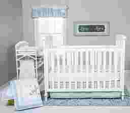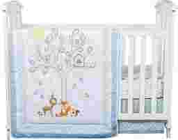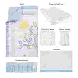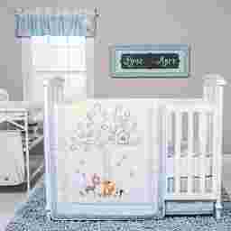 The Woodland Storytime Blue 6 Pc Baby Bedding Set with adorable forest animal appliques and embroideries in soft cotton prints in serene colors will add playful charm to your nursery. A baby deer, fox, squirrel, and snail are featured in a whimsical scene under a tree with an owl, and happy Mr. Sun. The calming color palette is perfect for any nursery in soft blue, sage, and taupe, mixed with perfect pops of burnt orange, and soft yellow. The quilt is backed in a blue dot print, and the fitted crib sheet, and the changing pad cover have a forest scatter print. The crib skirt and window valance feature a sweet blue plaid and dot print border, while an adorable owl, cloud, and bee appliques add finishing touches to the window valance. The diaper stacker has a forest scatter print with plaid trim and ties. This set fits a standard crib mattress, and includes quilt, crib skirt, fitted crib sheet, changing pad cover, window valance, and diaper stacker. Quilt: 100% cotton, (exclusive of decoration), Filling 100% polyester. Skirt - 100% cotton, Skirt Platform 100% olefin. Fitted Sheet; Changing Pad Cover; and Diaper Stacker: 100% cotton. Window Valance: 100% cotton, (exclusive of decoration). Machine wash cold and tumble dry low.