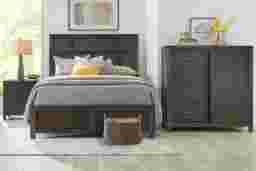 A statement in natural elegance inspired by the great design movements of the 20th century, the Woodley bedroom offers a fresh perspective and timeless look in equal measure. This traditional collection is crafted of wood products with oak veneers in a dark brown finish, displaying a rich woodgrain texture throughout. The panel headboard and footboard feature a board-and-batten design reminiscent of craftsman architecture. Matching pieces showcase a tailored modern profile, with details like metal bar pulls and flush drawer faces for a clean silhouette from any angle. The included nightstand completes the look with hidden USB charging ports on the back for a touch of convenience. Mattress and foundation (if required) sold separately.