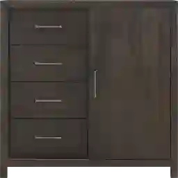 A statement in natural elegance inspired by the great design movements of the 20th century, the Woodley gentleman's chest offers a fresh perspective and timeless look in equal measure. This traditional accent is crafted of oak veneers in a dark brown finish, displaying a rich woodgrain texture throughout. Metal bar pulls and four flush drawer faces create a clean silhouette from any angle. Adding a charming final touch, the sliding door pulls to the side to reveal three storage shelves.