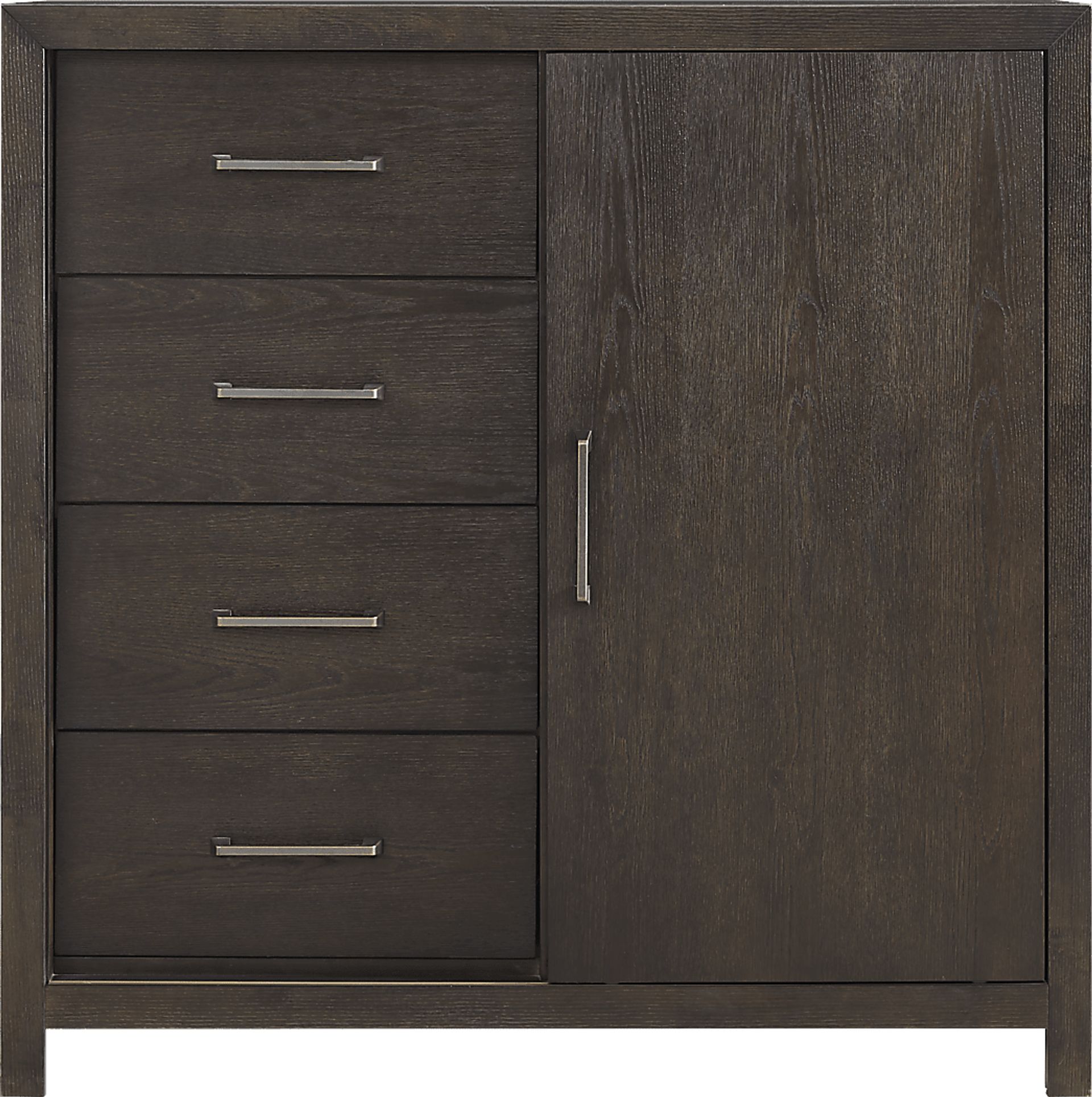 A statement in natural elegance inspired by the great design movements of the 20th century, the Woodley gentleman's chest offers a fresh perspective and timeless look in equal measure. This traditional accent is crafted of oak veneers in a dark brown finish, displaying a rich woodgrain texture throughout. Metal bar pulls and four flush drawer faces create a clean silhouette from any angle. Adding a charming final touch, the sliding door pulls to the side to reveal three storage shelves.