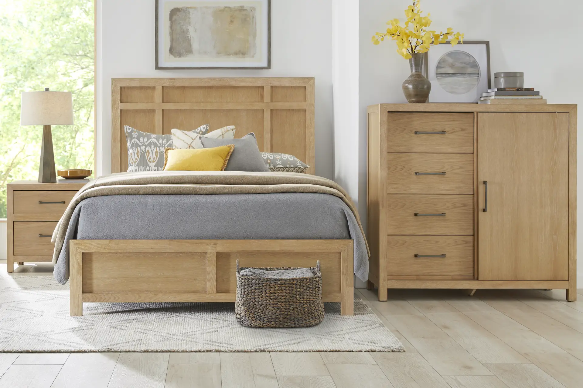 A statement in natural elegance inspired by the great design movements of the 20th century, the Woodley bedroom offers a fresh perspective and timeless look in equal measure. This traditional collection is crafted of wood products with oak veneers in a natural finish, displaying a rich woodgrain texture throughout. The panel headboard and footboard feature a board-and-batten design reminiscent of craftsman architecture. Matching pieces showcase a tailored modern profile, with details like metal bar pulls and flush drawer faces for a clean silhouette from any angle. The included nightstand completes the look with hidden USB charging ports on the back for a touch of convenience. Mattress and foundation (if required) sold separately.