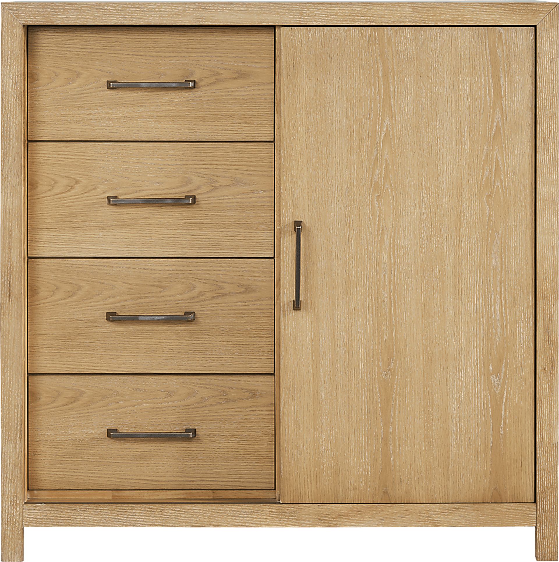 A statement in natural elegance inspired by the great design movements of the 20th century, the Woodley gentleman's chest offers a fresh perspective and timeless look in equal measure. This traditional accent is crafted of oak veneers in a natural finish, displaying a rich woodgrain texture throughout. Metal bar pulls and four flush drawer faces create a clean silhouette from any angle. Adding a charming final touch, the sliding door pulls to the side to reveal three storage shelves.