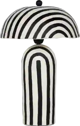 This lamp features innovative paper mache construction for both the base and the dome shade, offering a distinct, hand-crafted texture not found in traditional ceramic or metal lighting. This material allows for a bold, contemporary silhouette that is remarkably lightweight. The matte black finish and striped design provide a high-contrast, "one-of-a-kind" look that serves as a sophisticated focal point in boho or modern-industrial interiors.